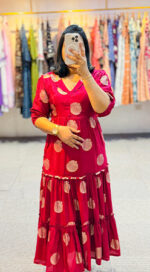 Kanirika is a bold and elegant ankle-length dress in a striking magenta hue, adorned with subtle gold circular floral motifs that add festive charm without overwhelming the look. Designed with a V-neckline, gathered empire waist, and 3/4th sleeves, it blends traditional detailing with a modern, comfortable silhouette— a piece that moves beautifully and speaks in color.